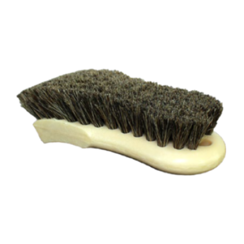 Cleaning brush with molded plastic ergonmoic handle and horsehair bristles, for use on fabric & vinyl materials, as well as interior upholstery.